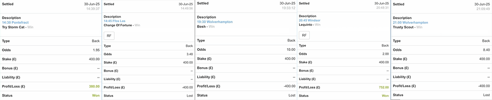 Result: Only Dappled Light won, with the others running below par.That left a £248 loss on the day, bringing the bank to £30,040.98.